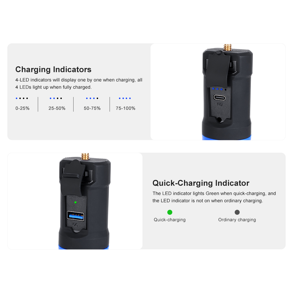 Quick Charging Support: Equipped with USB-C and USB-A output interfaces, the grip supports 20W PD/QC quick charging. The USB-C interface allows for two-way fast charging with an input power of up to 18W.