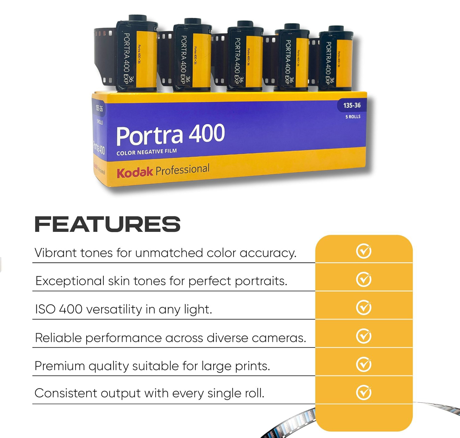 Kodak Portra Pro 400 135 36 Exposure 5 pack film is a high speed film that can be used for a variety of purposes where the action is fast or lighting can’t be controlled. It delivers exceptional colour saturation and features fine grain with a high degree of sharpness.