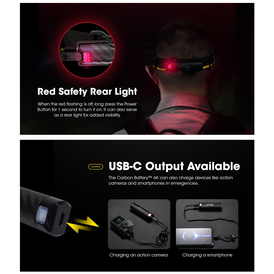 Besides powering your phone, the Carbon Battery 6K can be used to double or triple the runtime of Nitecore headlamps such as the NU40, NU43, NU50, and HC65 UHE. By connecting directly to the headlamp, the Carbon Battery 6K activates the headlamps' Performance Mode, ensuring long-lasting illumination and stronger brightness.