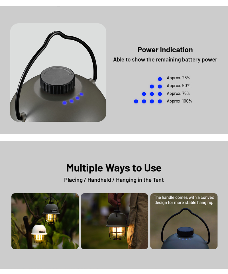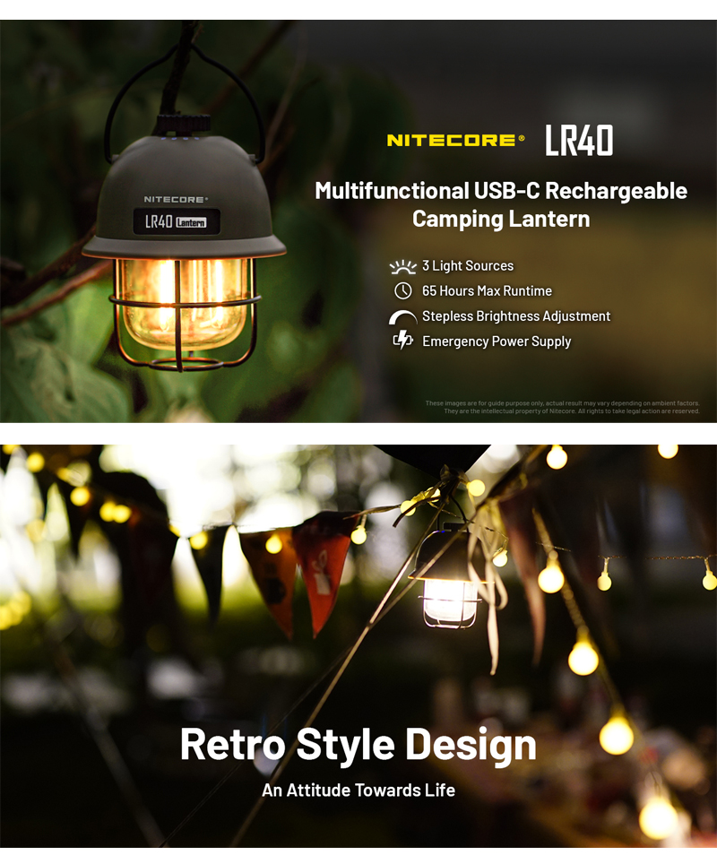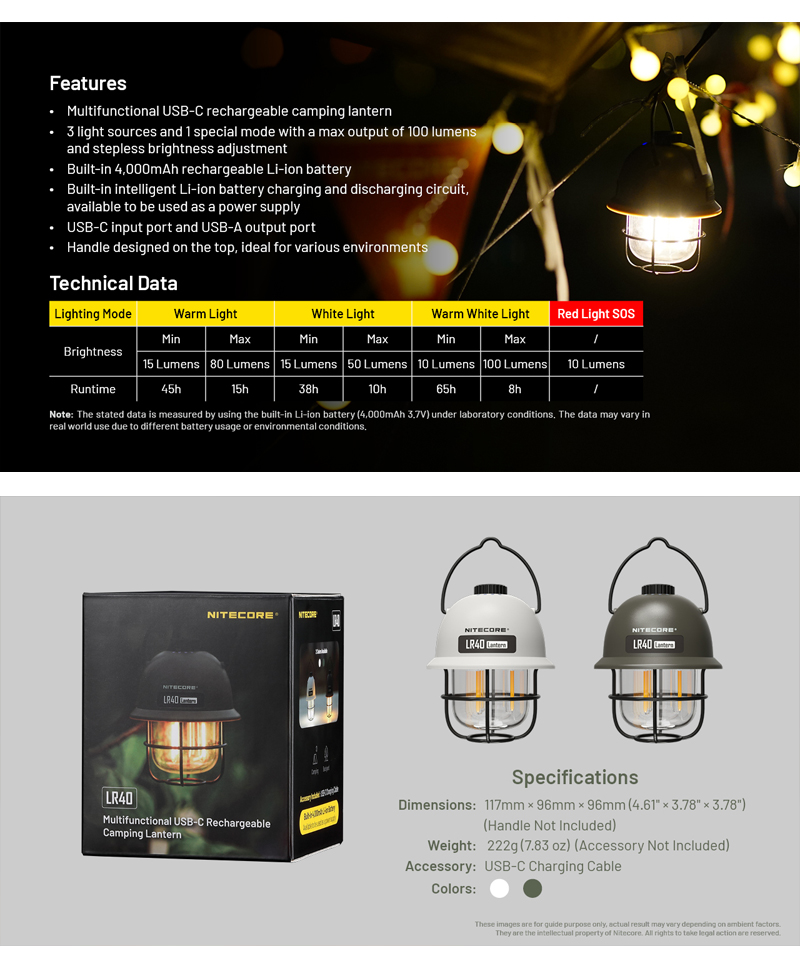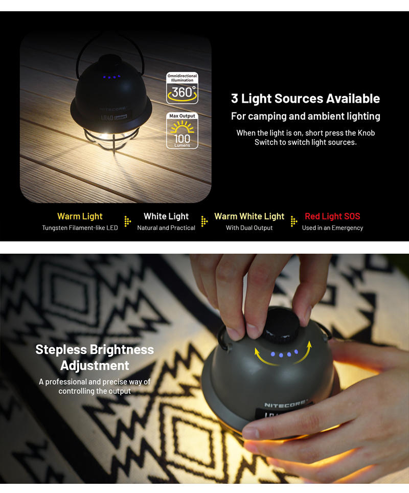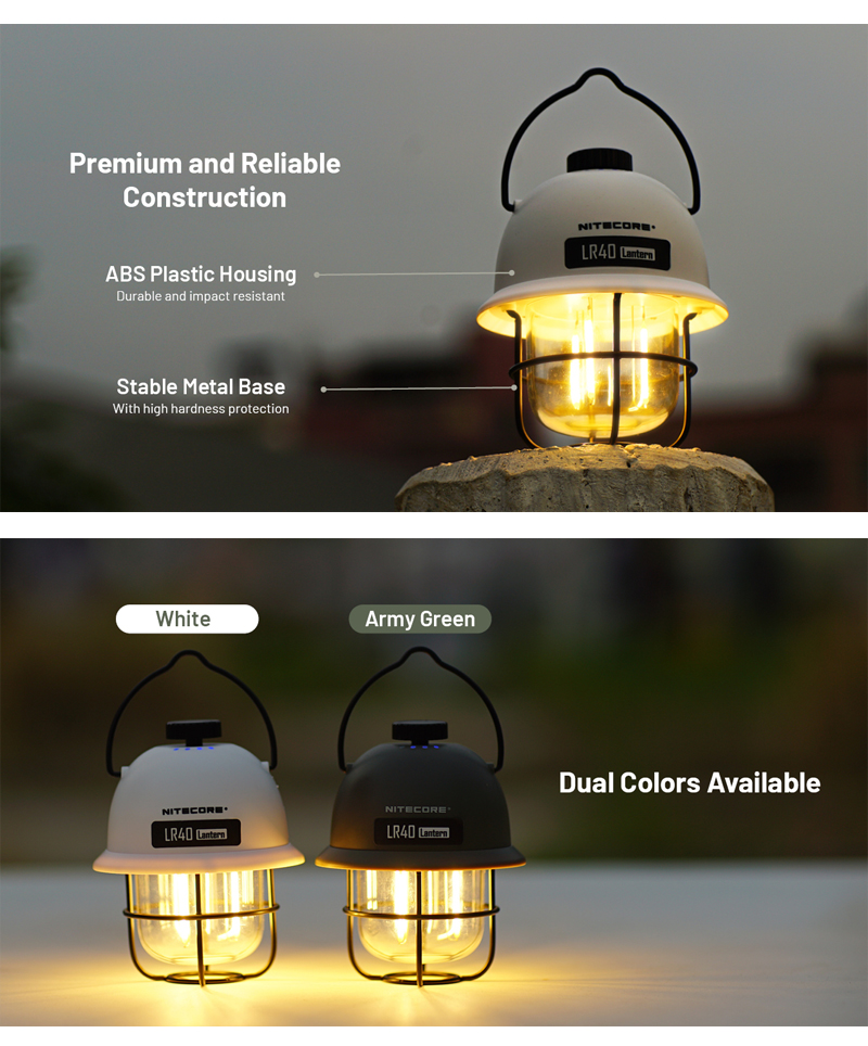 In addition to the multiple outputs, the LR40 can be used as a power bank. Beside the USB-C port to recharge the light, sits a USB-A output port for keeping your electronic devices charged. The lamp has an LED power indicator next to the dial switch so you know when it's time to recharge.The Nitecore LR40 can be hung or carried by the handle or set on a surface, such as a table or the ground. Available in army green or white.