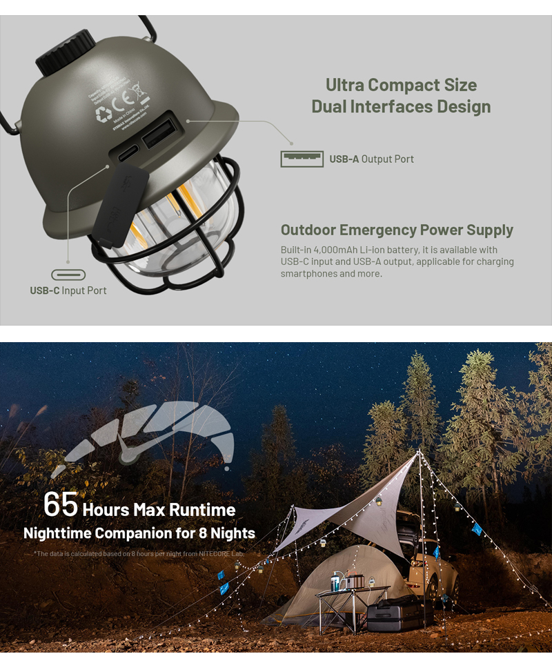 The Nitecore LR40 camping lantern has a maximum output of 100 lumens and is powered by a built-in 4000mAh li-ion battery which is rechargeable by USB-C.