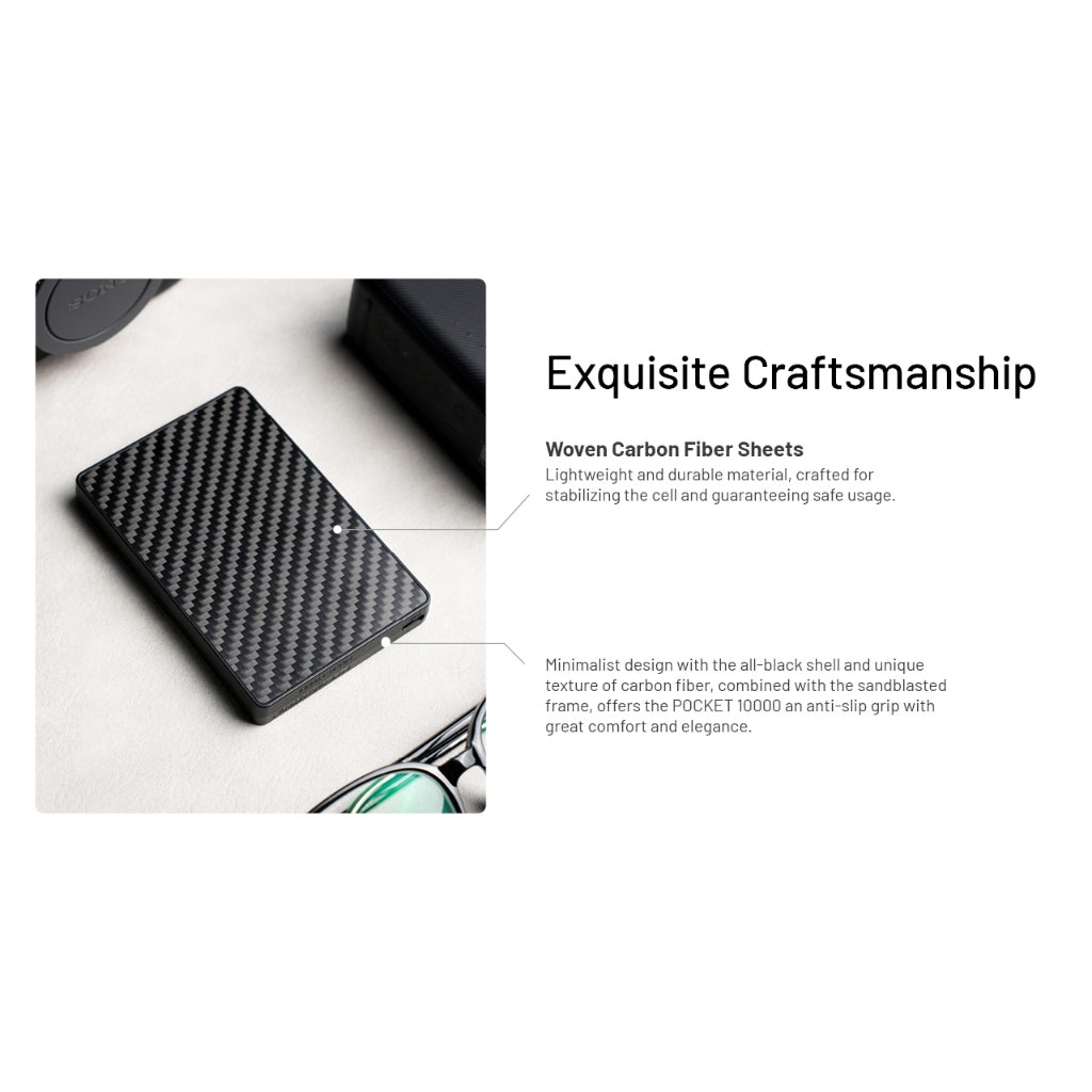 The Nitecore Pocket 10000 is a lightweight, portable power bank with a 10,000mAh capacity and a built-in USB-C charging cable, eliminating the need for extra wires wherever you go. Crafted with durable woven carbon fiber sheets, it’s tough enough for outdoor enthusiasts tackling trail running, hiking, and camping, while versatile enough for daily use as a dependable power source.