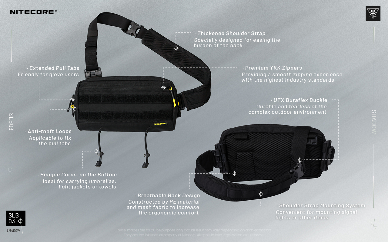 The Nitecore bag has a capacity of 1.6L and offers customisable expansion with a frontal MOLLE system. The exterior of the SLB03 includes bungee cords to carry an umbrella, towel or lightweight jacket, anti-theft loops, pre1mium YKK zippers, extended pull tabs and a breathable back design for your comfort.