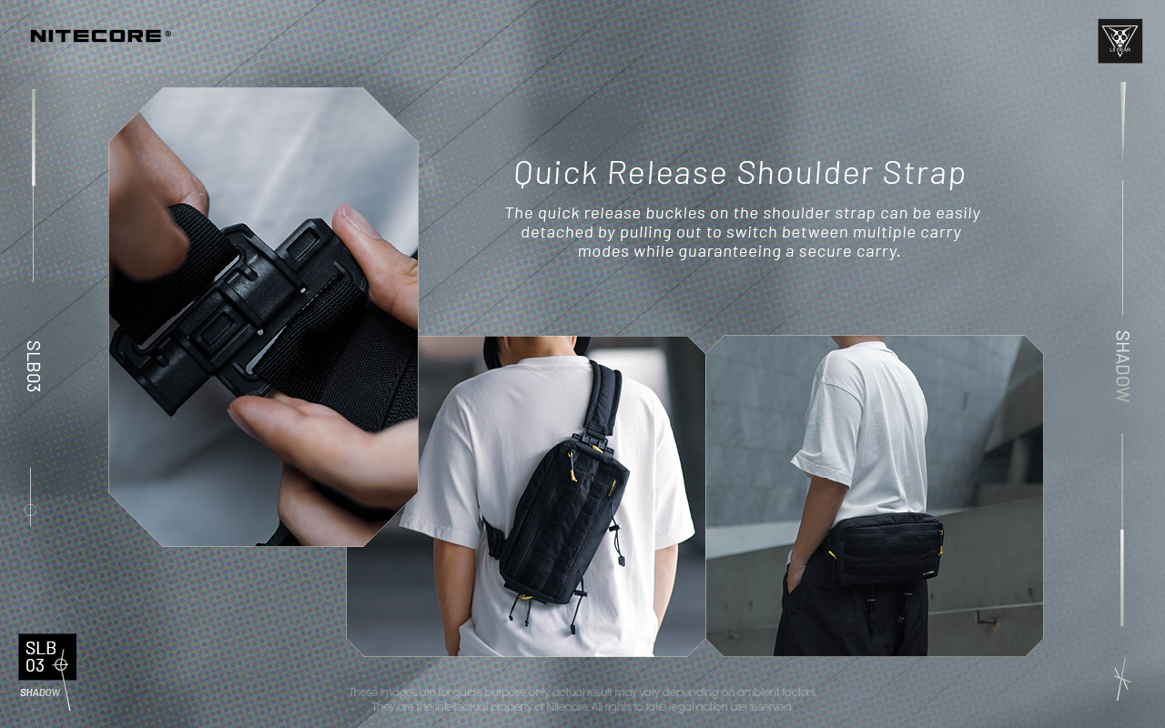The SLB03 is made from high density 500D nylon fabric with a water and scratch resistant coating. Featuring a quick release shoulder strap, the bag can easily be detached for quick access or to change how you're carrying it. The pack can be worn in several different ways, including as a sling bag, across the body or as a waist pack.