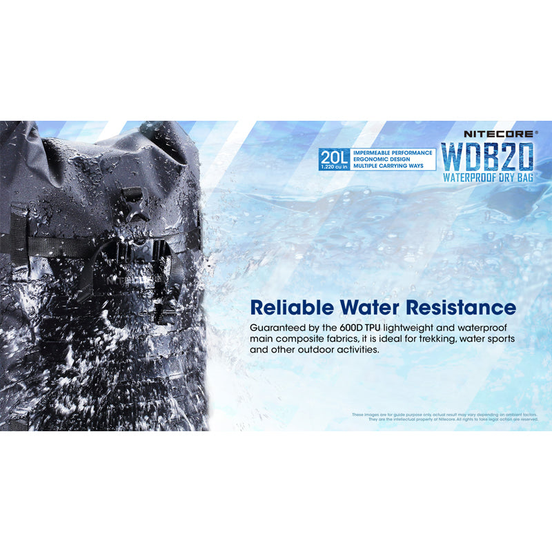 The Nitecore WDB20 is a 20L waterproof dry bag, designed for trekking, water sports and other outdoor activities. The bag features excellent impermeable performance, an ergonomic design and multiple carry options.