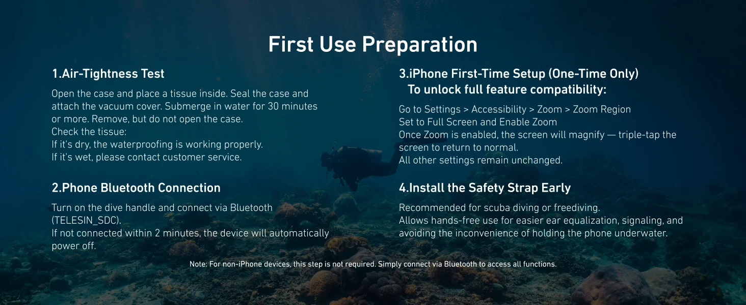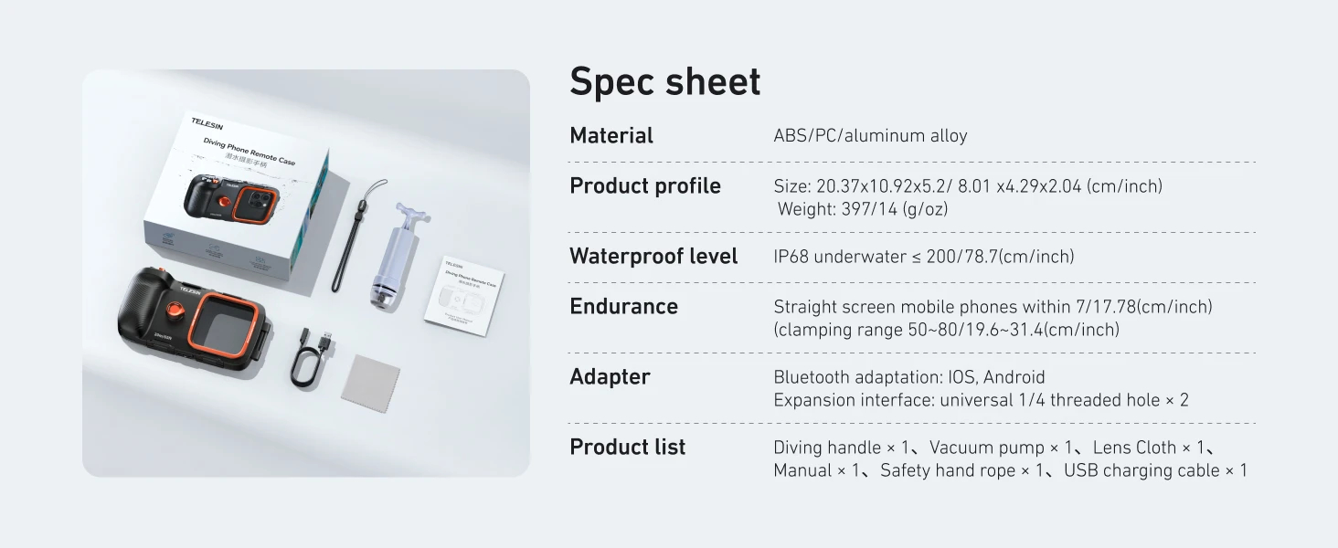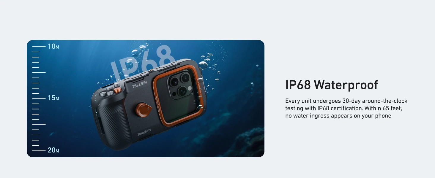 TELESIN Bluetooth Remote Waterproof Phone Case : Our underwater phone housing is compatible with smartphones ranging from 5.4 to 6.9 inches, including popular models from i*Phone, Android, Samsung, and more. With an IP68 waterproof rating, it allows you to dive up to 20 meters underwater. TELESIN Underwater Snorkeling Diving Phone Case built-in Bluetooth connection enables easy control of your phone’s camera even while submerged, so you can effortlessly capture every amazing moment.(Tips: Before entering the water, please set your phone screen to stay on (Always On Display)