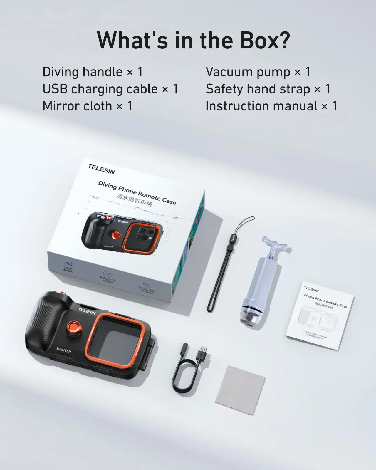 Diving Handle, Vacuum Pump, USB Cable, Wrist Strap, Cleaning Cloth, User Manual.