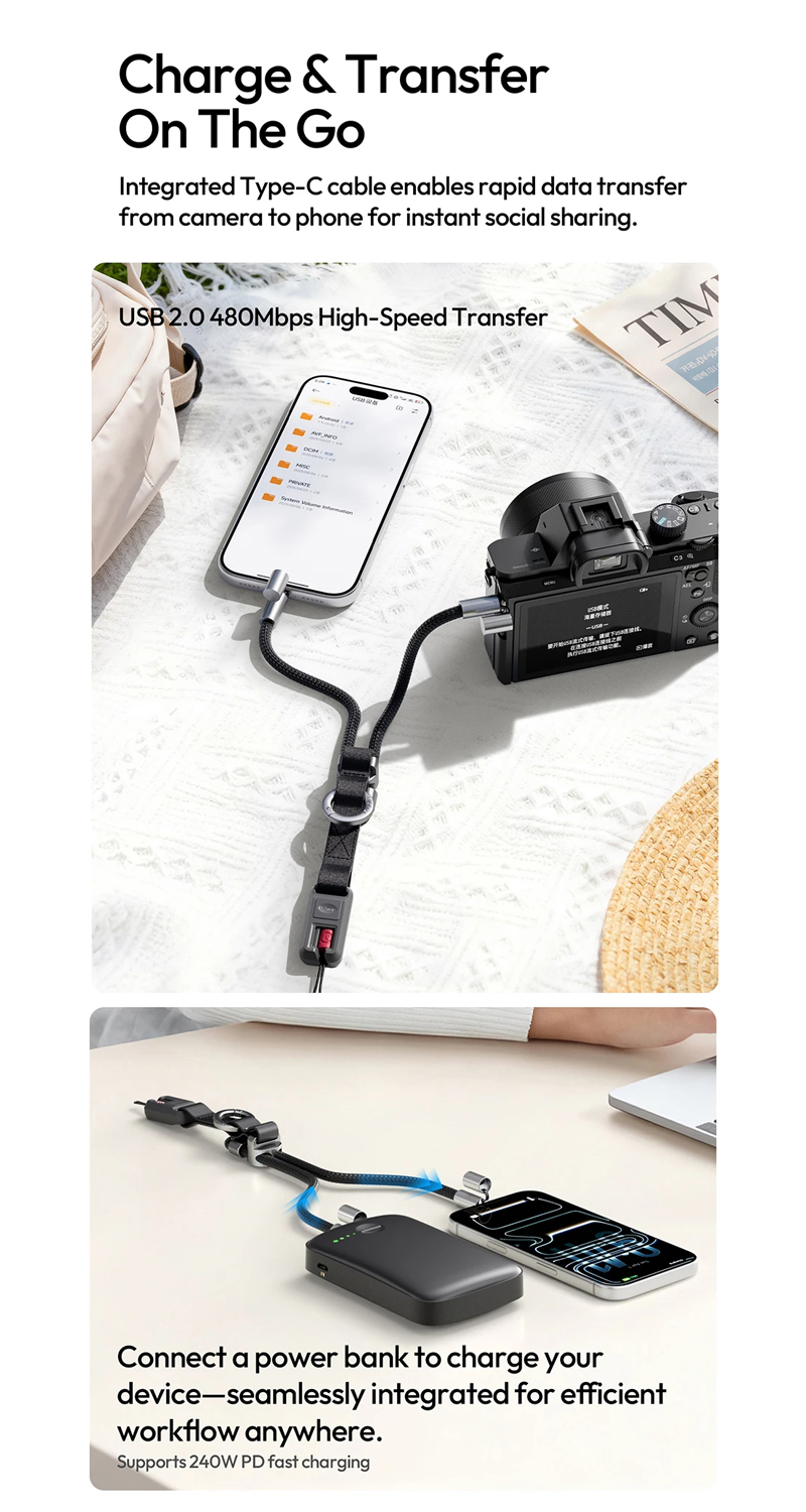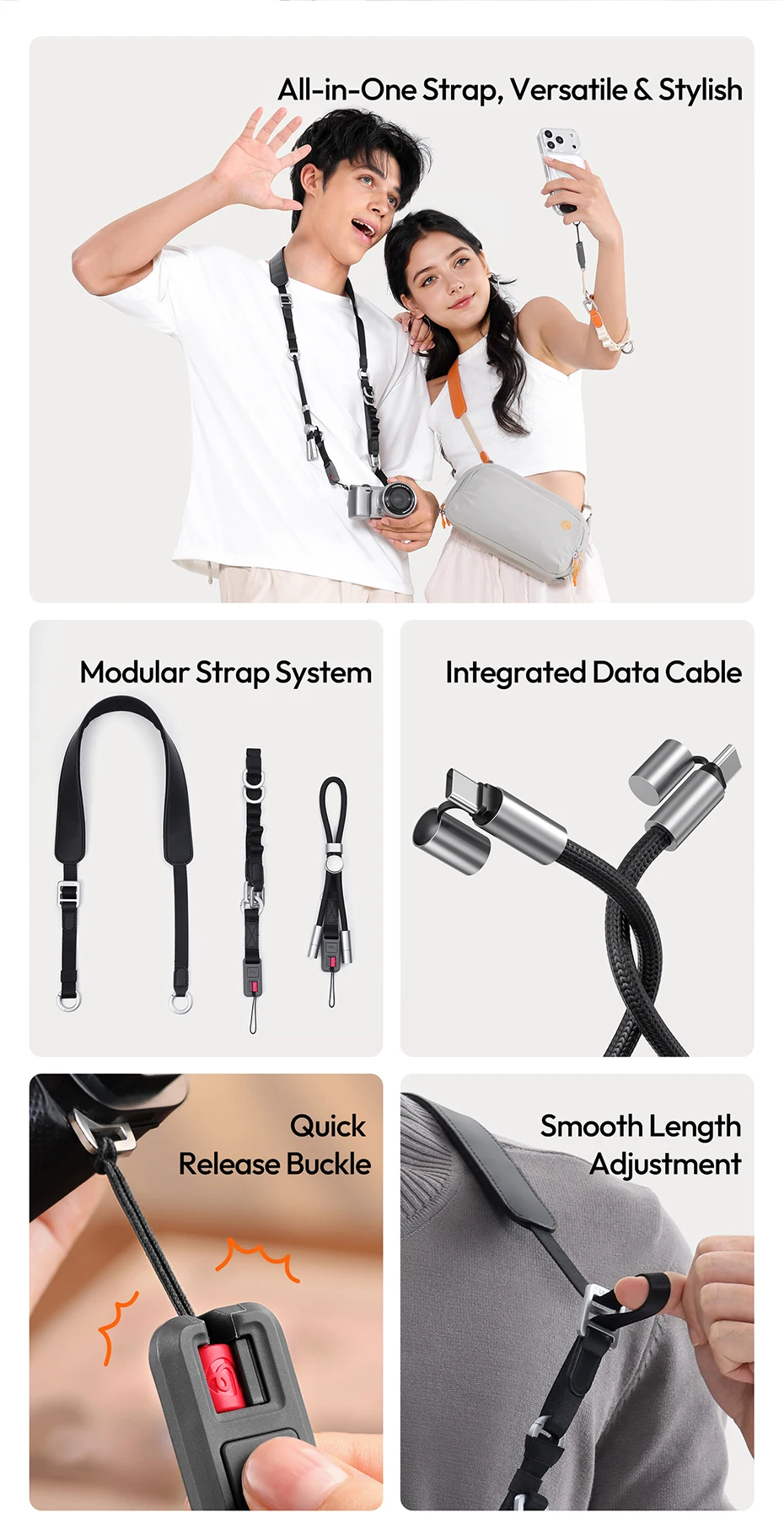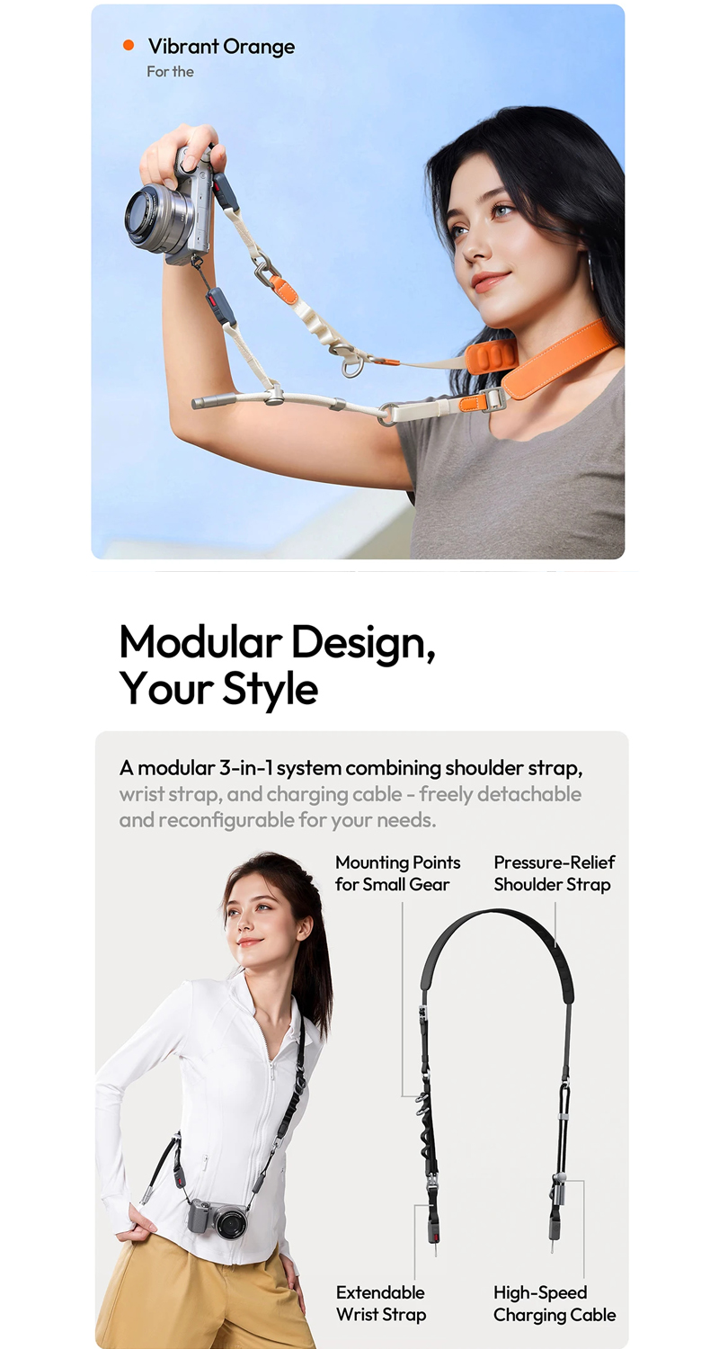 3-in-1 Modular Design: Combines shoulder strap + wrist strap + USB-C cable in one system. Mix and match freely to suit your shooting style.