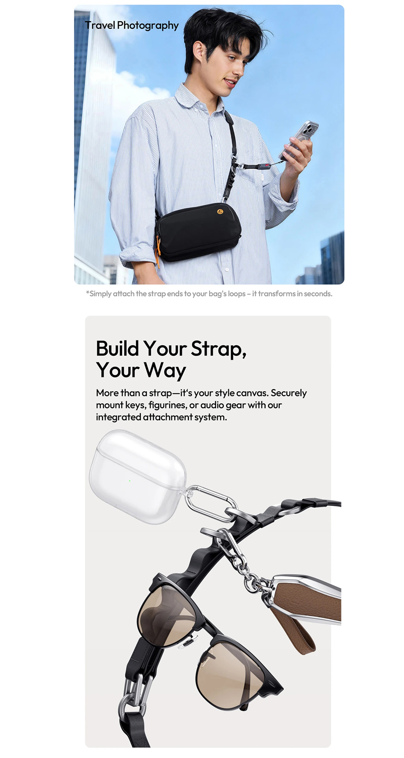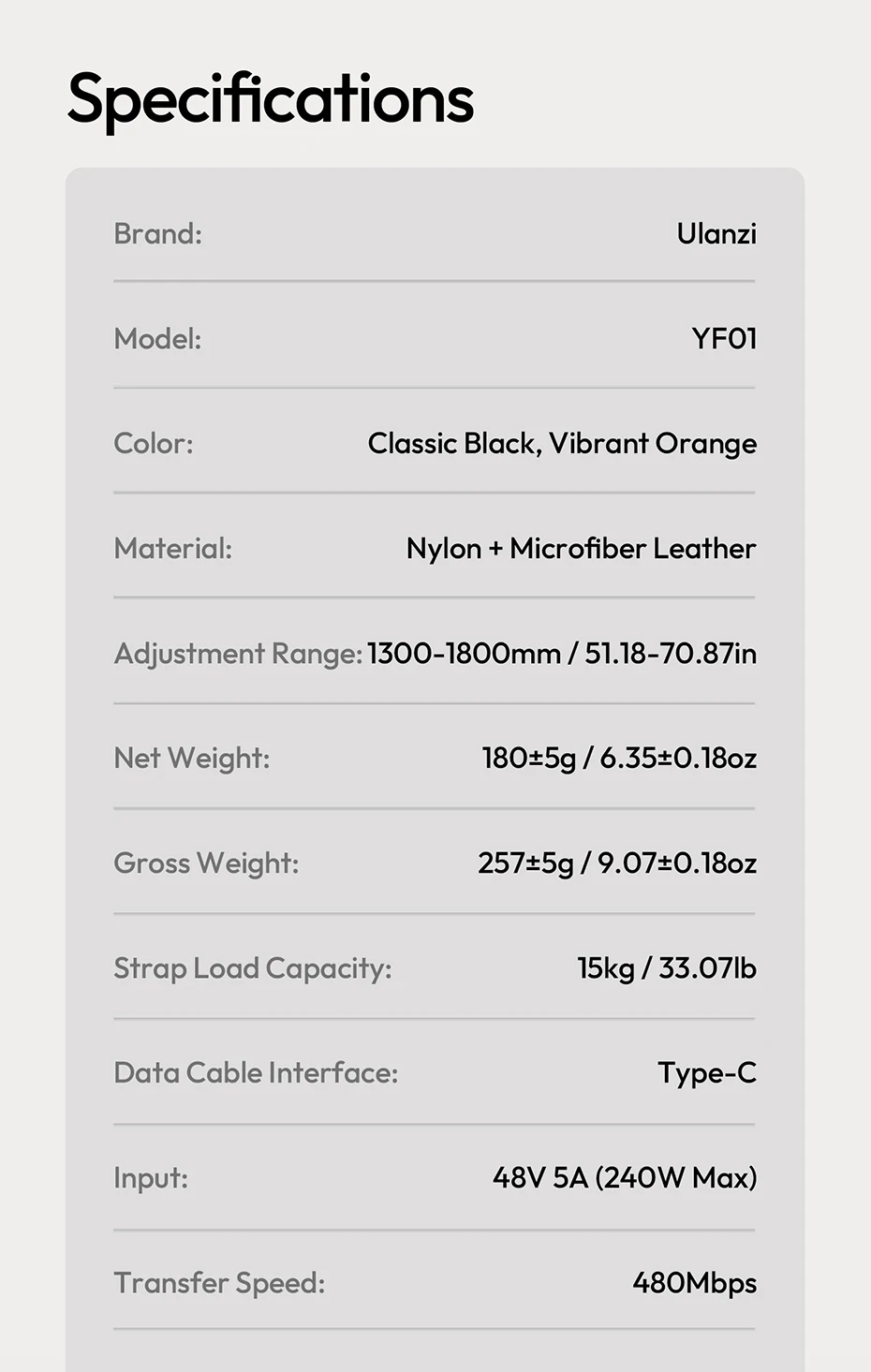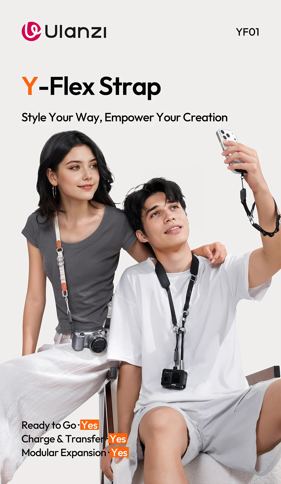 The Ulanzi YF01 Y-Flex Strap is a versatile 3-in-1 camera and phone carrying strap designed for creators who want fast switching, comfortable carry, and fewer accessories to pack. With its quick-release U-Snap connectors, you can detach or reconfigure the strap in seconds—perfect for travel photography, street shooting, vlogging, and everyday use. An integrated USB-C cable is built right into the strap for convenient charging and data transfer on the go.