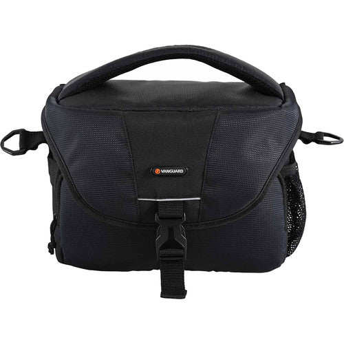The black BIIN II 25 Shoulder Bag from Vanguard holds a DSLR with a small attached lens, an additional lens, and a flash. This top-loading case features a zippered lid and a front flap with quick-release buckle. It has a front, zippered pocket and mesh pocket on the side. There's also a zippered mesh pocket under the lid. The top carry handle offers a secure grip and the adjustable shoulder strap allows you to wear it alongside or across your body.