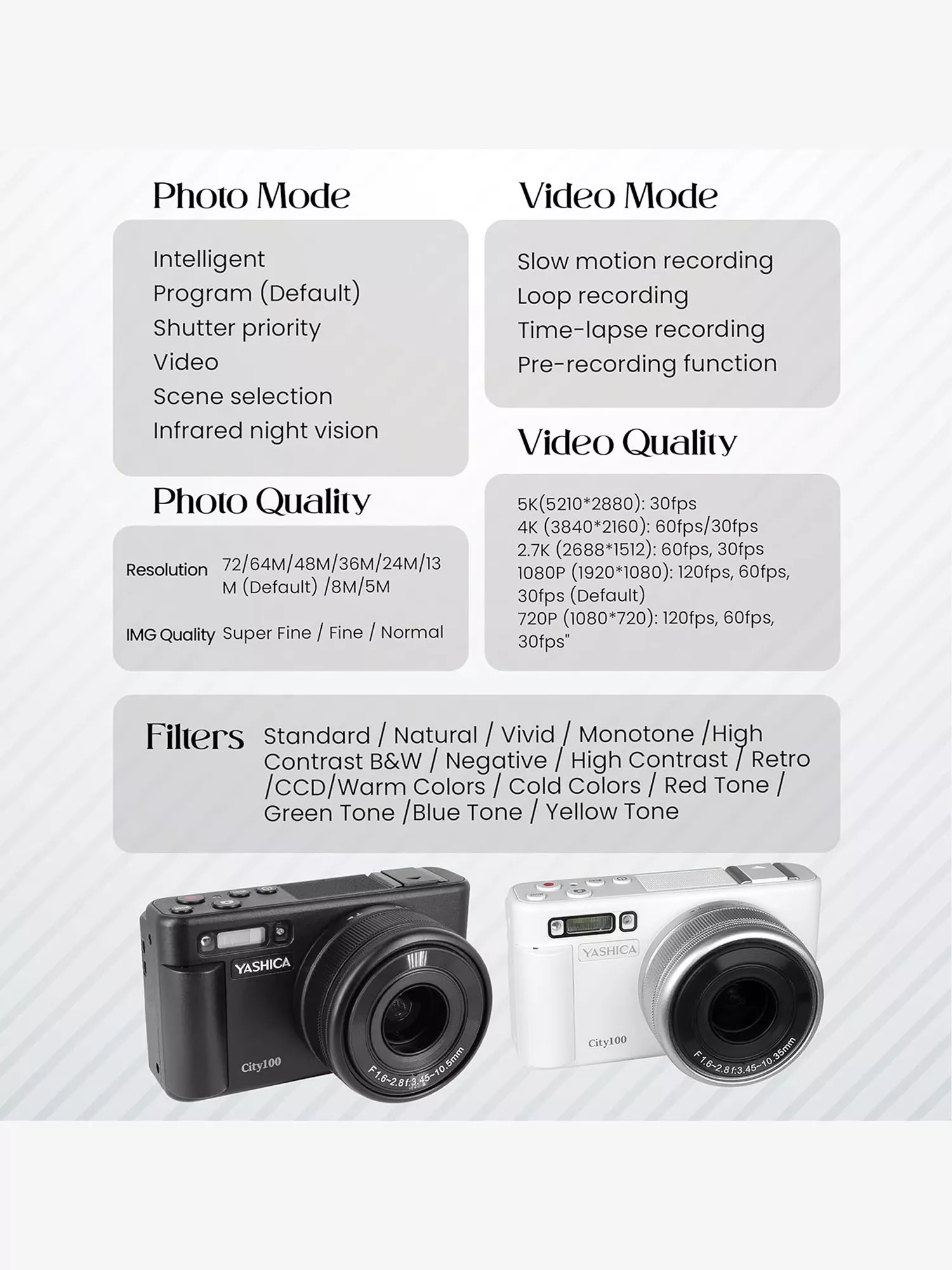 The YASHICA City100 in White is a powerful, high-resolution digital camera that merges sophisticated design with advanced imaging technology. Whether you’re capturing city life, natural landscapes, or everyday memories, the City100 offers the perfect blend of portability, performance, and styleideal for creators who value both form and function.