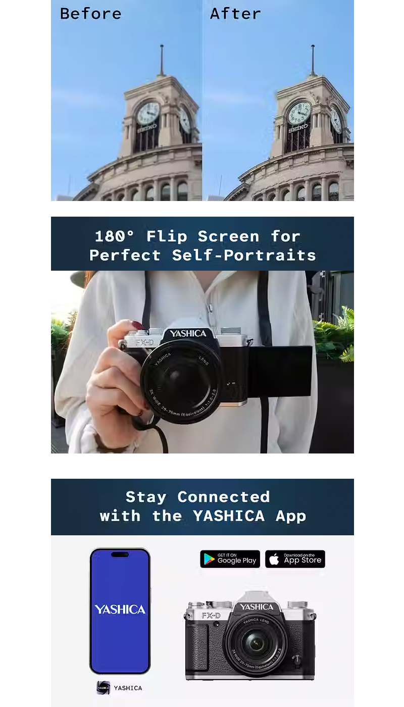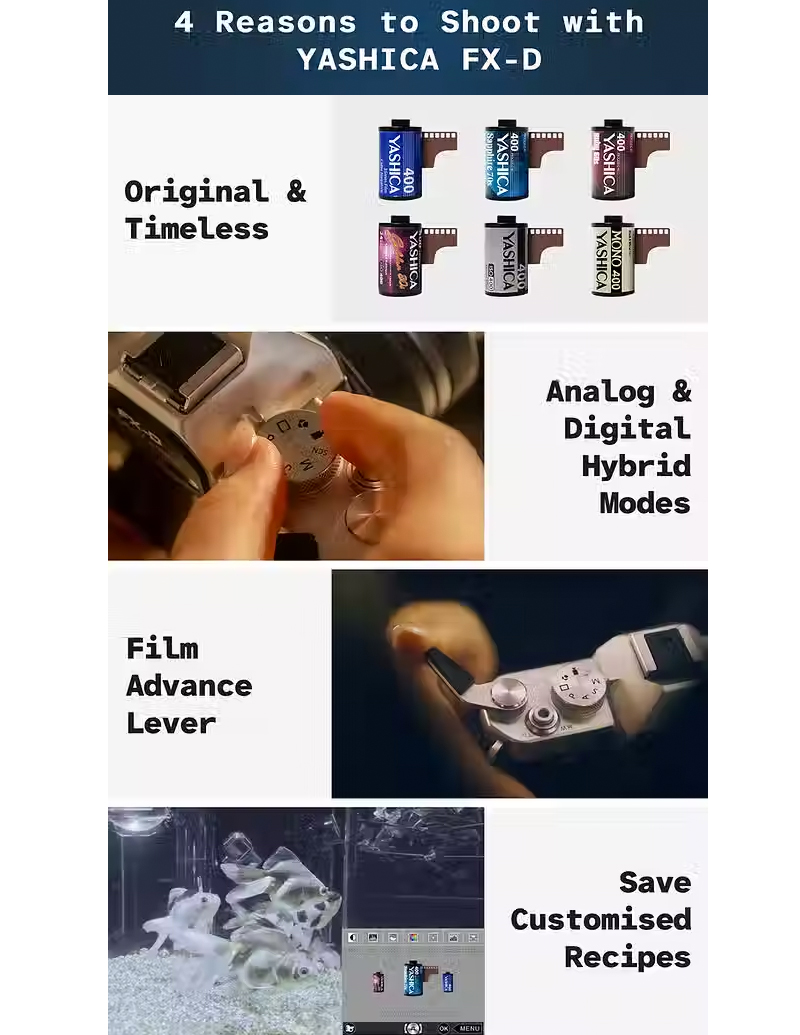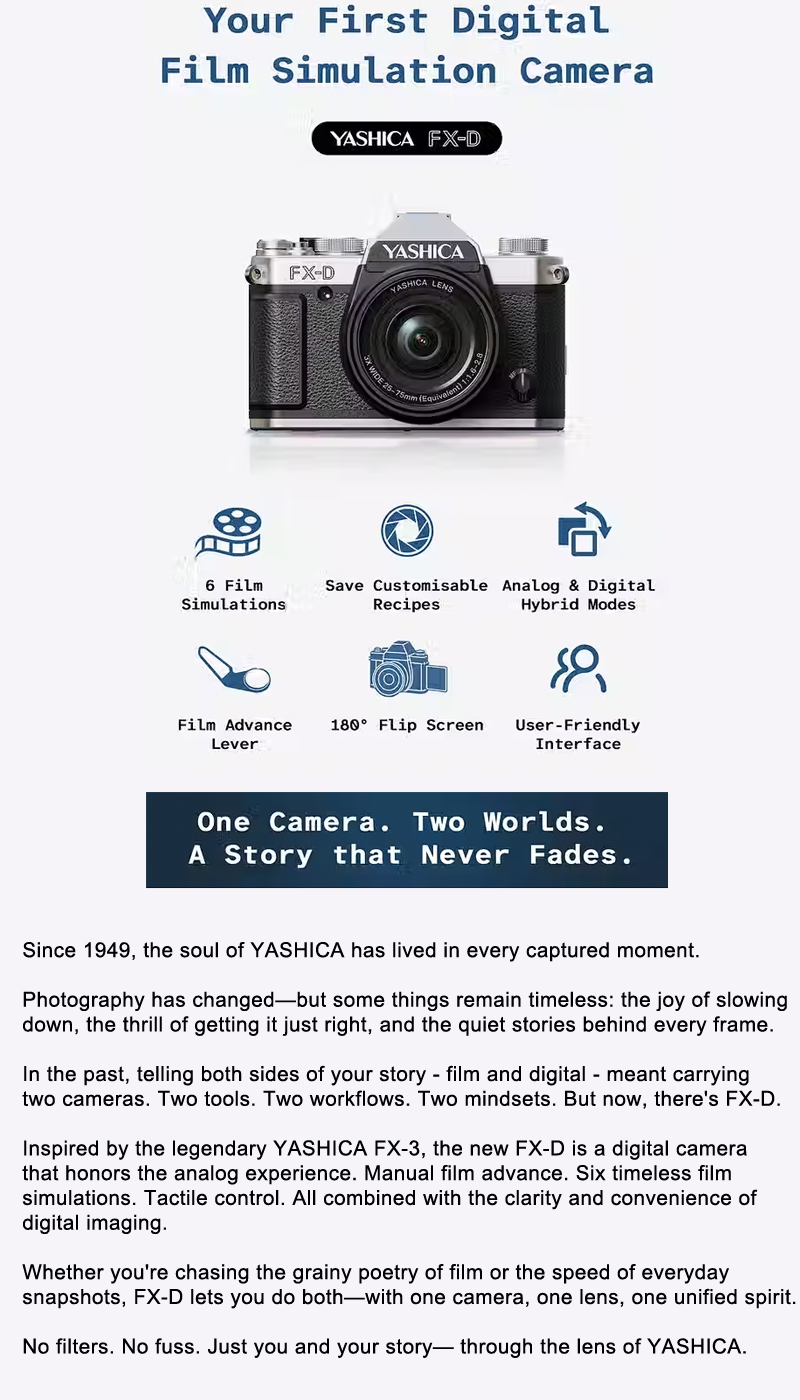 The Yashica FX-D 100 merges the classic FX-3 charm with digital capabilities. It honors analog craftsmanship with a manual film advance lever. Choose from six in-camera film simulations, including Ruby 60s and Sapphire 70s. The camera offers a unique Film Simulation Mode, replicating classic film stocks' rich effects. Fine-tune photos with advanced controls and save your favorite looks as recipes.