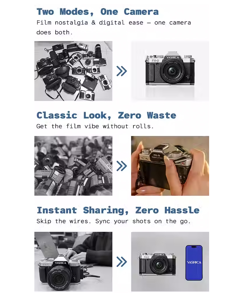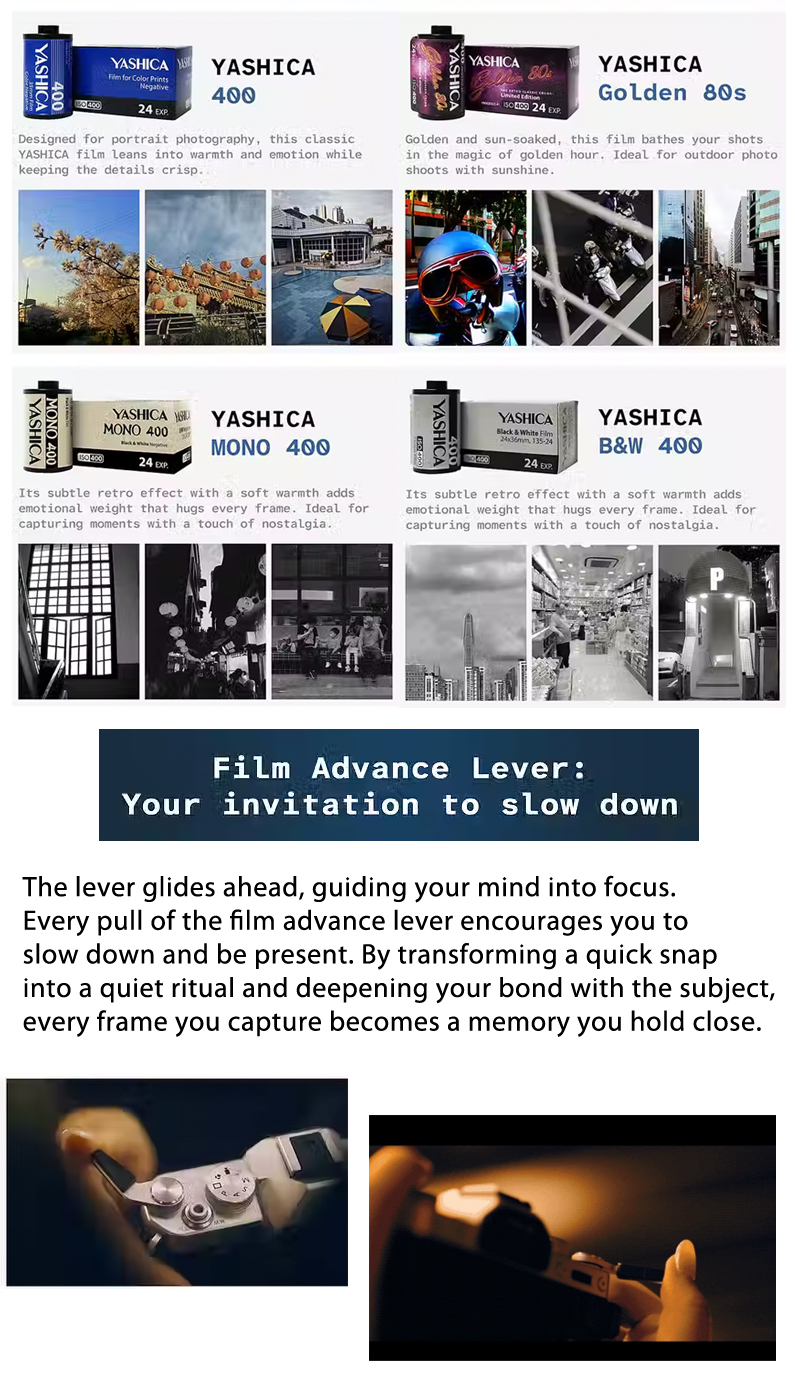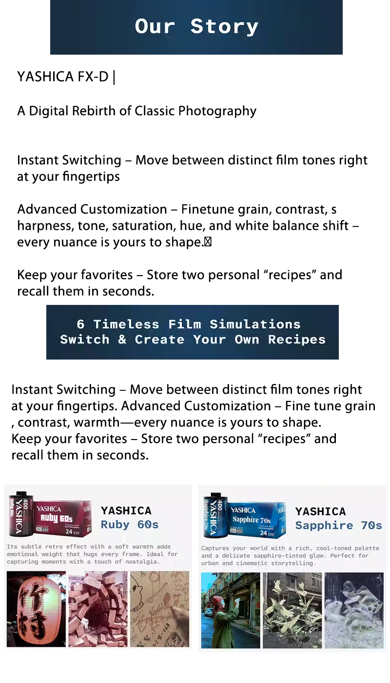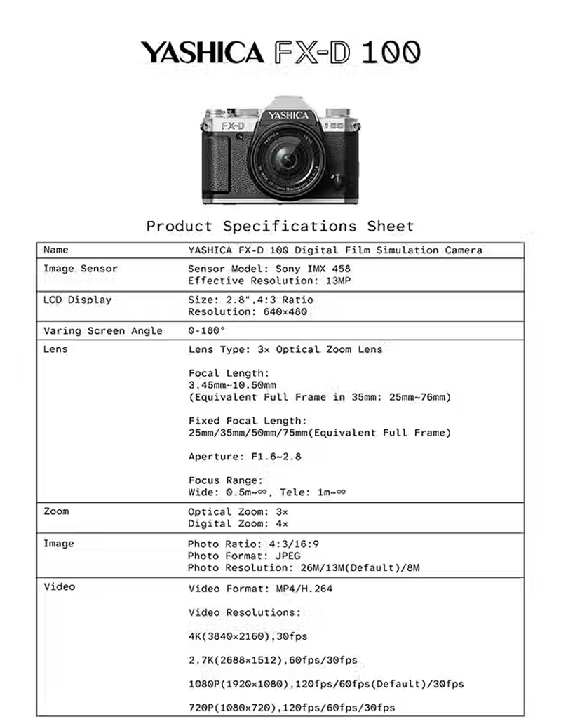 The Yashica FX-D 100 merges the classic FX-3 charm with digital capabilities. It honors analog craftsmanship with a manual film advance lever. Choose from six in-camera film simulations, including Ruby 60s and Sapphire 70s. The camera offers a unique Film Simulation Mode, replicating classic film stocks' rich effects. Fine-tune photos with advanced controls and save your favorite looks as recipes.