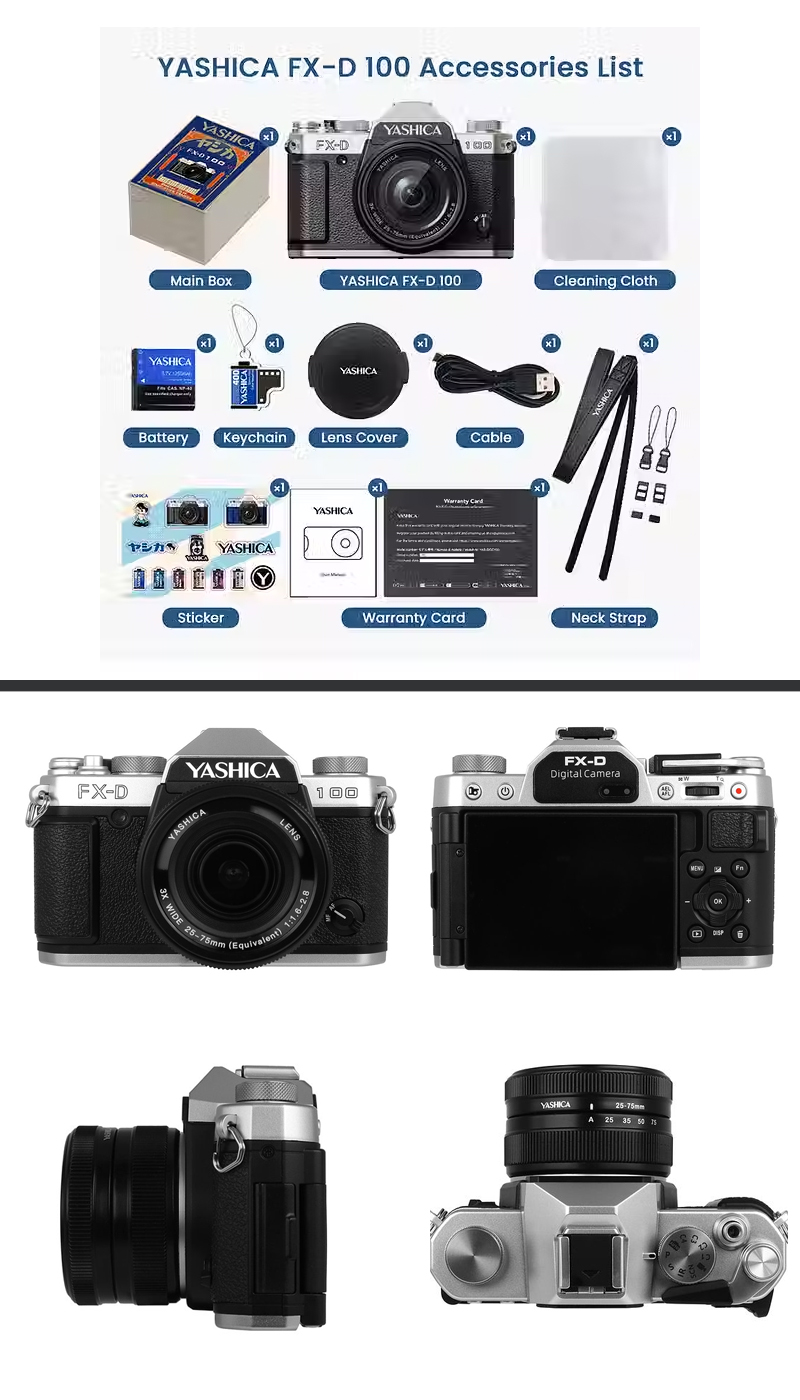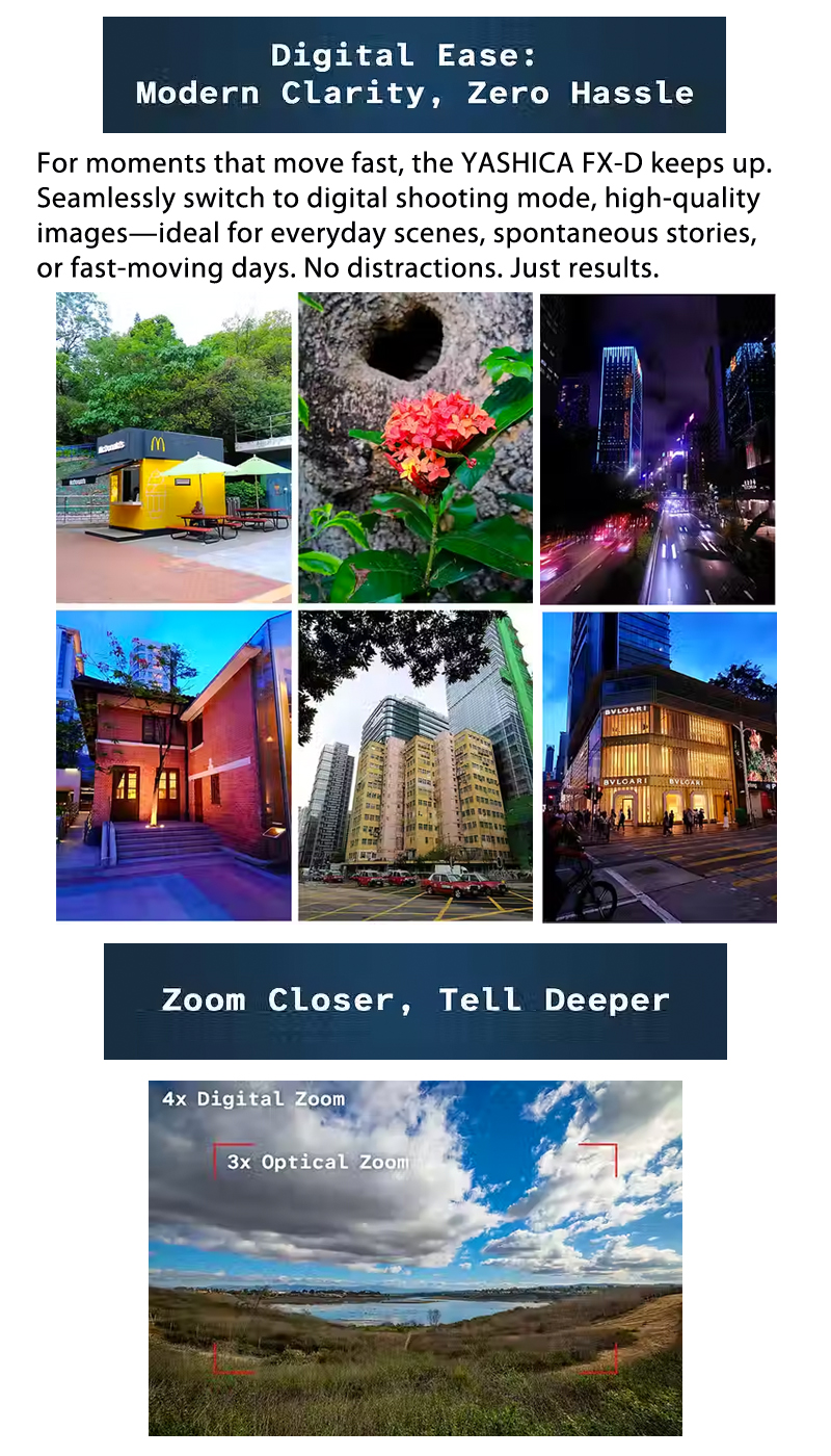 Enjoy advanced controls for photo editing. The Yashica FX-D 100 features a versatile 25–76 mm equivalent, 3x optical zoom lens. It supports manual and autofocus options. Capture moments swiftly in Digital Mode. Perfect for quick reactions or those preferring a simple digital workflow. Experience the perfect blend of old and new in photography.